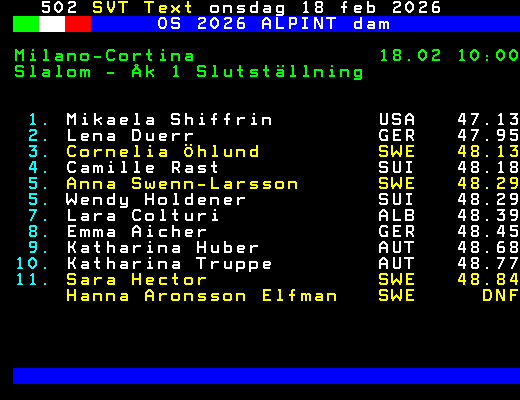 SVT Text Ons 18 Feb. 2026 OS 2026 ALPINT dam Milano-Cortina 18.02 10:00 Slalom - Åk 1 Slutställning 1. Mikaela Shiffrin USA 47.13 2. Lena Duerr GER 47.95 3. Cornelia Öhlund SWE 48.13 4. Camille Rast SUI 48.18 5. Anna Swenn-Larsson SWE 48.29 5. Wendy Holdener SUI 48.29 7. Lara Colturi ALB 48.39 8. Emma Aicher GER 48.45 9. Katharina Huber AUT 48.68 10. Katharina Truppe AUT 48.77 11. Sara Hector SWE 48.84 Hanna Aronsson Elfman SWE DNF +Dela 64 dagar