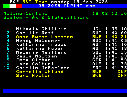OS 2026 ALPINT dam Milano-Cortina 18.02 13:30 Slalom - Åk 2 Slutställning 1. Mikaela Shiffrin USA 1:39.10 2. Camille Rast SUI 1:40.60 3. Anna Swenn-Larsson SWE 1:40.81 4. Wendy Holdener SUI 1:41.03 5. Katharina Truppe AUT 1:41.10 6. Katharina Huber AUT 1:41.18 7. Melanie Meillard SUI 1:41.25 8. Paula Moltzan USA 1:41.29 9. Emma Aicher GER 1:41.59 10. Lara Colturi ALB 1:41.78 10. Caitlin McFarlane FRA 1:41.78 Cornelia Öhlund SWE DNF Sara Hector SWE DNF +Dela 63 dagar