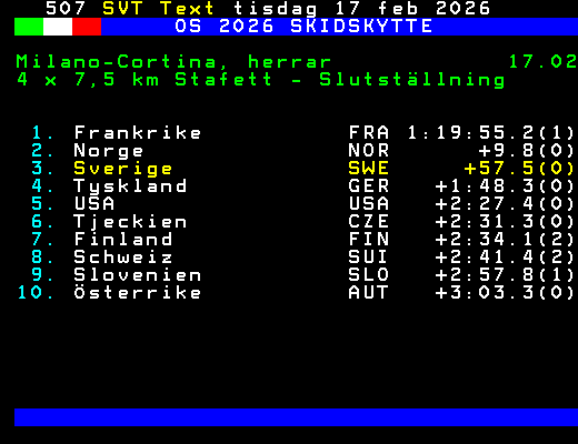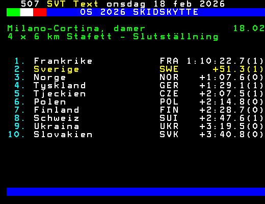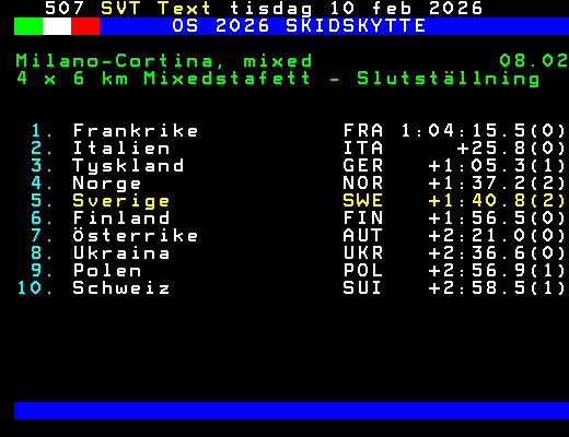 SVT Text Tis 10 Feb. 2026 OS 2026 SKIDSKYTTE Milano-Cortina, mixed 08.02 4 x 6 km Mixedstafett - Slutställning 1. Frankrike FRA 1:04:15.5(0) 2. Italien ITA +25.8(0) 3. Tyskland GER +1:05.3(1) 4. Norge NOR +1:37.2(2) 5. Sverige SWE +1:40.8(2) 6. Finland FIN +1:56.5(0) 7. Österrike AUT +2:21.0(0) 8. Ukraina UKR +2:36.6(0) 9. Polen POL +2:56.9(1) 10. Schweiz SUI +2:58.5(1) +Dela 71 dagar