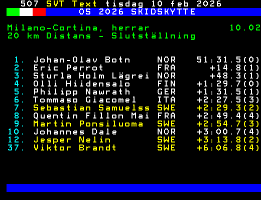 OS 2026 SKIDSKYTTE Milano-Cortina, herrar 10.02 20 km Distans - Slutställning 1. Johan-Olav Botn NOR 51:31.5(0) 2. Eric Perrot FRA +14.8(1) 3. Sturla Holm Lägrei NOR +48.3(1) 4. Olli Hiidensalo FIN +1:29.7(0) 5. Philipp Nawrath GER +1:31.5(1) 6. Tommaso Giacomel ITA +2:27.5(3) 7. Sebastian Samuelss SWE +2:29.3(2) 8. Quentin Fillon Mai FRA +2:49.4(4) 9. Martin Ponsiluoma SWE +2:54.7(3) 10. Johannes Dale NOR +3:00.7(4) 12. Jesper Nelin SWE +3:13.8(2) 37. Viktor Brandt SWE +6:06.8(4) +Dela 71 dagar
