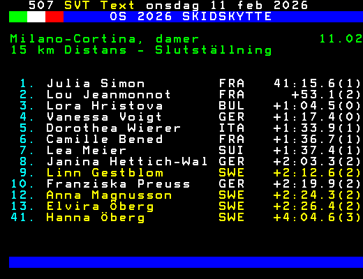 OS 2026 SKIDSKYTTE Milano-Cortina, damer 11.02 15 km Distans - Slutställning 1. Julia Simon FRA 41:15.6(1) 2. Lou Jeanmonnot FRA +53.1(2) 3. Lora Hristova BUL +1:04.5(0) 4. Vanessa Voigt GER +1:17.4(0) 5. Dorothea Wierer ITA +1:33.9(1) 6. Camille Bened FRA +1:36.7(1) 7. Lea Meier SUI +1:37.4(1) 8. Janina Hettich-Wal GER +2:03.3(2) 9. Linn Gestblom SWE +2:12.6(2) 10. Franziska Preuss GER +2:19.9(2) 12. Anna Magnusson SWE +2:24.3(2) 13. Elvira Öberg SWE +2:26.4(2) 41. Hanna Öberg SWE +4:04.6(3) +Dela 70 dagar