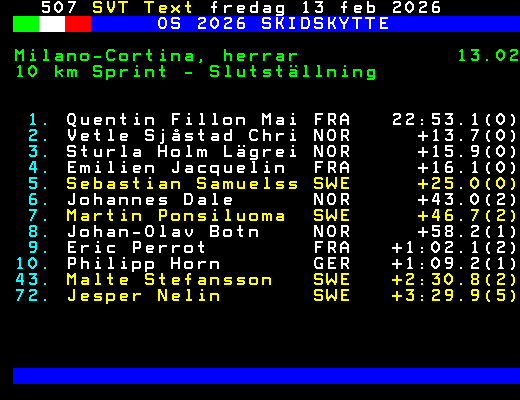 OS 2026 SKIDSKYTTE Milano-Cortina, herrar 13.02 10 km Sprint - Slutställning 1. Quentin Fillon Mai FRA 22:53.1(0) 2. Vetle Sjåstad Chri NOR +13.7(0) 3. Sturla Holm Lägrei NOR +15.9(0) 4. Emilien Jacquelin FRA +16.1(0) 5. Sebastian Samuelss SWE +25.0(0) 6. Johannes Dale NOR +43.0(2) 7. Martin Ponsiluoma SWE +46.7(2) 8. Johan-Olav Botn NOR +58.2(1) 9. Eric Perrot FRA +1:02.1(2) 10. Philipp Horn GER +1:09.2(1) 43. Malte Stefansson SWE +2:30.8(2) 72. Jesper Nelin SWE +3:29.9(5) +Dela 68 dagar
