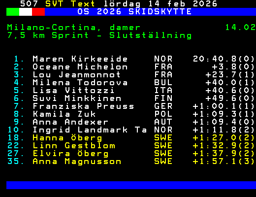 OS 2026 SKIDSKYTTE Milano-Cortina, damer 14.02 7,5 km Sprint - Slutställning 1. Maren Kirkeeide NOR 20:40.8(0) 2. Oceane Michelon FRA +3.8(0) 3. Lou Jeanmonnot FRA +23.7(1) 4. Milena Todorova BUL +40.0(1) 5. Lisa Vittozzi ITA +40.6(0) 6. Suvi Minkkinen FIN +49.6(0) 7. Franziska Preuss GER +1:00.1(1) 8. Kamila Zuk POL +1:09.3(1) 9. Anna Andexer AUT +1:09.4(0) 10. Ingrid Landmark Ta NOR +1:11.8(2) 18. Hanna Öberg SWE +1:27.0(2) 22. Linn Gestblom SWE +1:32.9(2) 27. Elvira Öberg SWE +1:37.9(2) 35. Anna Magnusson SWE +1:57.1(3) +Dela 67 dagar