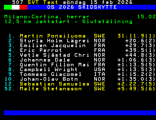OS 2026 SKIDSKYTTE Milano-Cortina, herrar 15.02 12,5 km Jaktstart - Slutställning 1. Martin Ponsiluoma SWE 31:11.9(1) 2. Sturla Holm Lägrei NOR +20.6(2) 3. Emilien Jacquelin FRA +29.7(3) 4. Eric Perrot FRA +39.5(1) 5. Vetle Sjåstad Chri NOR +44.8(3) 6. Johannes Dale NOR +1:06.6(3) 7. Quentin Fillon Mai FRA +1:13.5(5) 8. Campbell Wright USA +1:13.5(3) 9. Tommaso Giacomel ITA +1:15.2(2) 10. Johan-Olav Botn NOR +1:35.0(3) 12. Sebastian Samuelss SWE +2:22.7(5) 52. Malte Stefansson SWE +5:49.5(6) +Dela 67 dagar