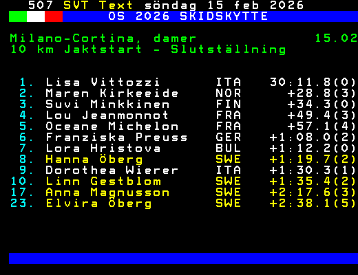OS 2026 SKIDSKYTTE Milano-Cortina, damer 15.02 10 km Jaktstart - Slutställning 1. Lisa Vittozzi ITA 30:11.8(0) 2. Maren Kirkeeide NOR +28.8(3) 3. Suvi Minkkinen FIN +34.3(0) 4. Lou Jeanmonnot FRA +49.4(3) 5. Oceane Michelon FRA +57.1(4) 6. Franziska Preuss GER +1:08.0(2) 7. Lora Hristova BUL +1:12.2(0) 8. Hanna Öberg SWE +1:19.7(2) 9. Dorothea Wierer ITA +1:30.3(1) 10. Linn Gestblom SWE +1:35.4(2) 17. Anna Magnusson SWE +2:17.6(3) 23. Elvira Öberg SWE +2:38.1(5) +Dela 66 dagar
