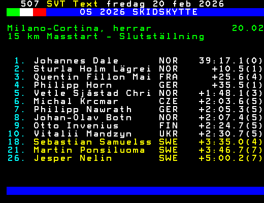 OS 2026 SKIDSKYTTE Milano-Cortina, herrar 20.02 15 km Masstart - Slutställning 1. Johannes Dale NOR 39:17.1(0) 2. Sturla Holm Lägrei NOR +10.5(1) 3. Quentin Fillon Mai FRA +25.6(4) 4. Philipp Horn GER +35.5(1) 5. Vetle Sjåstad Chri NOR +1:48.1(3) 6. Michal Krcmar CZE +2:03.6(5) 7. Philipp Nawrath GER +2:05.3(5) 8. Johan-Olav Botn NOR +2:07.4(5) 9. Otto Invenius FIN +2:24.7(5) 10. Vitalii Mandzyn UKR +2:30.7(5) 18. Sebastian Samuelss SWE +3:35.0(4) 21. Martin Ponsiluoma SWE +3:46.7(7) 26. Jesper Nelin SWE +5:00.2(7) +Dela 61 dagar