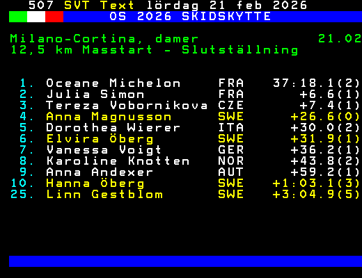 OS 2026 SKIDSKYTTE Milano-Cortina, damer 21.02 12,5 km Masstart - Slutställning 1. Oceane Michelon FRA 37:18.1(2) 2. Julia Simon FRA +6.6(1) 3. Tereza Vobornikova CZE +7.4(1) 4. Anna Magnusson SWE +26.6(0) 5. Dorothea Wierer ITA +30.0(2) 6. Elvira Öberg SWE +31.9(1) 7. Vanessa Voigt GER +36.2(1) 8. Karoline Knotten NOR +43.8(2) 9. Anna Andexer AUT +59.2(1) 10. Hanna Öberg SWE +1:03.1(3) 25. Linn Gestblom SWE +3:04.9(5) +Dela 60 dagar