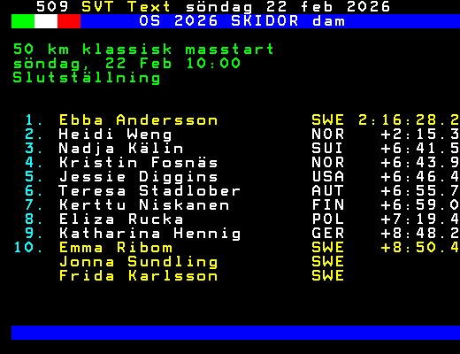 SVT Text Sön 22 Feb. 2026 OS 2026 SKIDOR dam 50 km klassisk masstart söndag, 22 Feb 10:00 Slutställning 1. Ebba Andersson SWE 2:16:28.2 2. Heidi Weng NOR +2:15.3 3. Nadja Kälin SUI +6:41.5 4. Kristin Fosnäs NOR +6:43.9 5. Jessie Diggins USA +6:46.4 6. Teresa Stadlober AUT +6:55.7 7. Kerttu Niskanen FIN +6:59.0 8. Eliza Rucka POL +7:19.4 9. Katharina Hennig GER +8:48.2 10. Emma Ribom SWE +8:50.4 Jonna Sundling SWE Frida Karlsson SWE +Dela 59 dagar