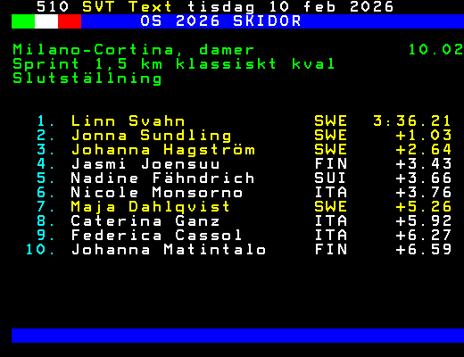 OS 2026 SKIDOR Milano-Cortina, damer 10.02 Sprint 1,5 km klassiskt kval Slutställning 1. Linn Svahn SWE 3:36.21 2. Jonna Sundling SWE +1.03 3. Johanna Hagström SWE +2.64 4. Jasmi Joensuu FIN +3.43 5. Nadine Fähndrich SUI +3.66 6. Nicole Monsorno ITA +3.76 7. Maja Dahlqvist SWE +5.26 8. Caterina Ganz ITA +5.92 9. Federica Cassol ITA +6.27 10. Johanna Matintalo FIN +6.59 +Dela 72 dagar