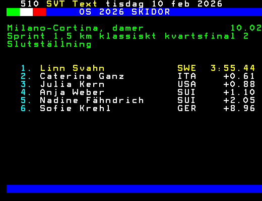 OS 2026 SKIDOR Milano-Cortina, damer 10.02 Sprint 1,5 km klassiskt kvartsfinal 2 Slutställning 1. Linn Svahn SWE 3:55.44 2. Caterina Ganz ITA +0.61 3. Julia Kern USA +0.88 4. Anja Weber SUI +1.10 5. Nadine Fähndrich SUI +2.05 6. Sofie Krehl GER +8.96 +Dela 71 dagar