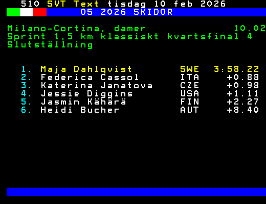 OS 2026 SKIDOR Milano-Cortina, damer 10.02 Sprint 1,5 km klassiskt kvartsfinal 4 Slutställning 1. Maja Dahlqvist SWE 3:58.22 2. Federica Cassol ITA +0.88 3. Katerina Janatova CZE +0.98 4. Jessie Diggins USA +1.11 5. Jasmin Kähärä FIN +2.27 6. Heidi Bucher AUT +8.40 +Dela 71 dagar