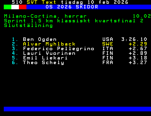 OS 2026 SKIDOR Milano-Cortina, herrar 10.02 Sprint 1,5 km klassiskt kvartsfinal 2 Slutställning 1. Ben Ogden USA 3:26.10 2. Alvar Myhlback SWE +2.29 3. Federico Pellegrino ITA +2.67 4. Lauri Vuorinen FIN +2.89 5. Emil Liekari FIN +3.18 6. Theo Schely FRA +3.27 +Dela 71 dagar