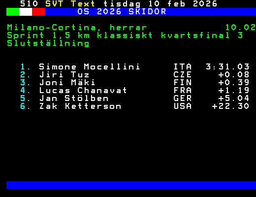 OS 2026 SKIDOR Milano-Cortina, herrar 10.02 Sprint 1,5 km klassiskt kvartsfinal 3 Slutställning 1. Simone Mocellini ITA 3:31.03 2. Jiri Tuz CZE +0.08 3. Joni Mäki FIN +0.39 4. Lucas Chanavat FRA +1.19 5. Jan Stölben GER +5.04 6. Zak Ketterson USA +22.30 +Dela 71 dagar