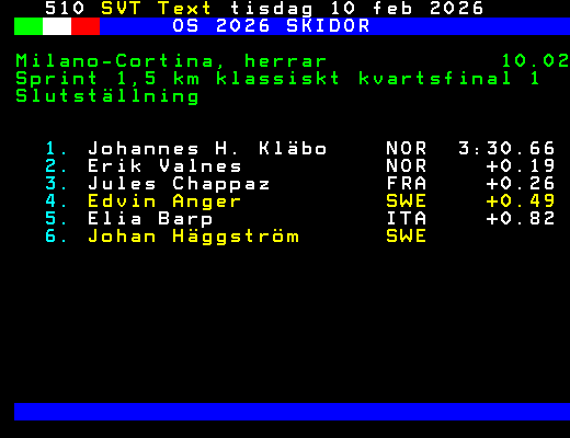 OS 2026 SKIDOR Milano-Cortina, herrar 10.02 Sprint 1,5 km klassiskt kvartsfinal 1 Slutställning 1. Johannes H. Kläbo NOR 3:30.66 2. Erik Valnes NOR +0.19 3. Jules Chappaz FRA +0.26 4. Edvin Anger SWE +0.49 5. Elia Barp ITA +0.82 6. Johan Häggström SWE +Dela 71 dagar