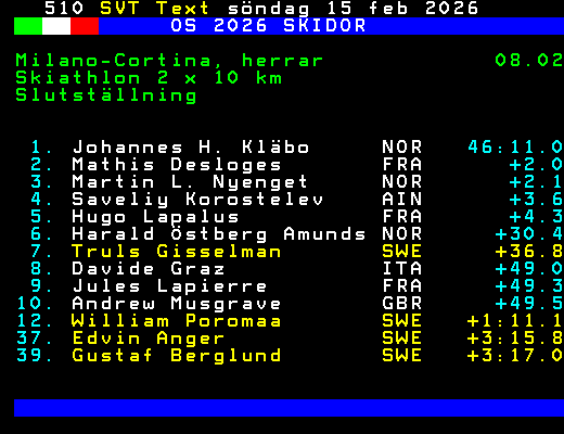 OS 2026 SKIDOR Milano-Cortina, herrar 08.02 Skiathlon 2 x 10 km Slutställning 1. Johannes H. Kläbo NOR 46:11.0 2. Mathis Desloges FRA +2.0 3. Martin L. Nyenget NOR +2.1 4. Saveliy Korostelev AIN +3.6 5. Hugo Lapalus FRA +4.3 6. Harald Östberg Amunds NOR +30.4 7. Truls Gisselman SWE +36.8 8. Davide Graz ITA +49.0 9. Jules Lapierre FRA +49.3 10. Andrew Musgrave GBR +49.5 12. William Poromaa SWE +1:11.1 37. Edvin Anger SWE +3:15.8 39. Gustaf Berglund SWE +3:17.0 +Dela 67 dagar