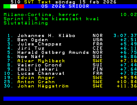 OS 2026 SKIDOR Milano-Cortina, herrar 10.02 Sprint 1,5 km klassiskt kval Slutställning 1. Johannes H. Kläbo NOR 3:07.37 2. Ben Ogden USA +2.51 3. Jules Chappaz FRA +5.49 4. Jiri Tuz CZE +6.11 5. Harald Östberg Amunds NOR +6.75 6. Noe Näff SUI +6.86 7. Alvar Myhlback SWE +7.16 8. Valerio Grond SUI +7.44 9. Emil Liekari FIN +7.64 10. Lucas Chanavat FRA +7.92 19. Edvin Anger SWE +9.94 25. Anton Grahn SWE +10.84 30. Johan Häggström SWE +11.36 +Dela 67 dagar