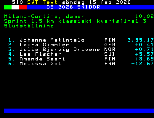 OS 2026 SKIDOR Milano-Cortina, damer 10.02 Sprint 1,5 km klassiskt kvartsfinal 3 Slutställning 1. Johanna Matintalo FIN 3:55.17 2. Laura Gimmler GER +0.41 3. Julie Bjervig Drivene NOR +0.71 4. Lea Fischer SUI +5.57 5. Amanda Saari FIN +8.69 6. Melissa Gal FRA +12.67 +Dela 67 dagar