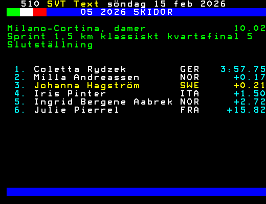 OS 2026 SKIDOR Milano-Cortina, damer 10.02 Sprint 1,5 km klassiskt kvartsfinal 5 Slutställning 1. Coletta Rydzek GER 3:57.75 2. Milla Andreassen NOR +0.17 3. Johanna Hagström SWE +0.21 4. Iris Pinter ITA +1.50 5. Ingrid Bergene Aabrek NOR +2.72 6. Julie Pierrel FRA +15.82 +Dela 67 dagar
