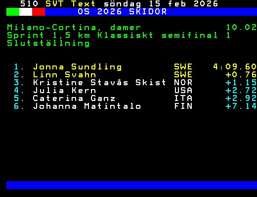 OS 2026 SKIDOR Milano-Cortina, damer 10.02 Sprint 1,5 km Klassiskt semifinal 1 Slutställning 1. Jonna Sundling SWE 4:09.60 2. Linn Svahn SWE +0.76 3. Kristine Stavås Skist NOR +1.15 4. Julia Kern USA +2.72 5. Caterina Ganz ITA +2.92 6. Johanna Matintalo FIN +7.14 +Dela 67 dagar