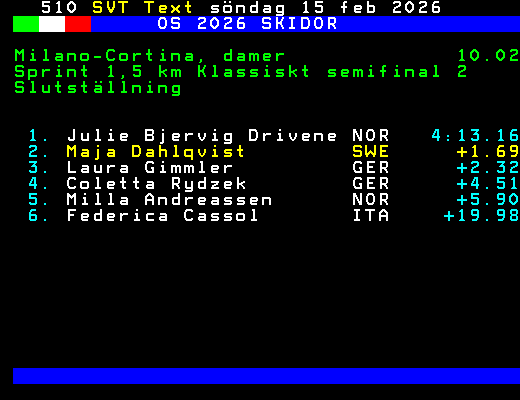 OS 2026 SKIDOR Milano-Cortina, damer 10.02 Sprint 1,5 km Klassiskt semifinal 2 Slutställning 1. Julie Bjervig Drivene NOR 4:13.16 2. Maja Dahlqvist SWE +1.69 3. Laura Gimmler GER +2.32 4. Coletta Rydzek GER +4.51 5. Milla Andreassen NOR +5.90 6. Federica Cassol ITA +19.98 +Dela 67 dagar