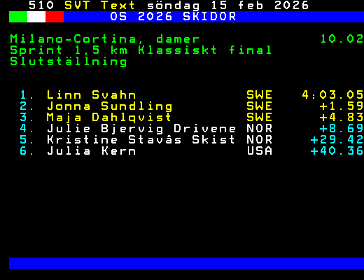 OS 2026 SKIDOR Milano-Cortina, damer 10.02 Sprint 1,5 km Klassiskt final Slutställning 1. Linn Svahn SWE 4:03.05 2. Jonna Sundling SWE +1.59 3. Maja Dahlqvist SWE +4.83 4. Julie Bjervig Drivene NOR +8.69 5. Kristine Stavås Skist NOR +29.42 6. Julia Kern USA +40.36 +Dela 67 dagar