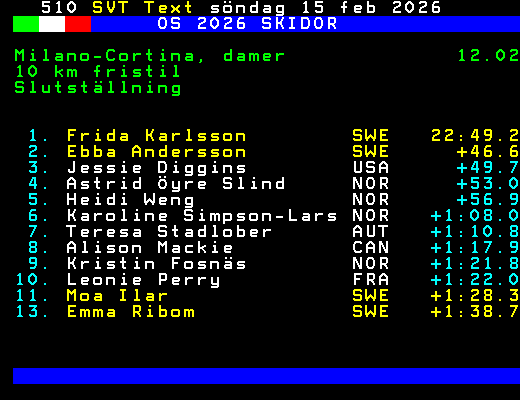 OS 2026 SKIDOR Milano-Cortina, damer 12.02 10 km fristil Slutställning 1. Frida Karlsson SWE 22:49.2 2. Ebba Andersson SWE +46.6 3. Jessie Diggins USA +49.7 4. Astrid Öyre Slind NOR +53.0 5. Heidi Weng NOR +56.9 6. Karoline Simpson-Lars NOR +1:08.0 7. Teresa Stadlober AUT +1:10.8 8. Alison Mackie CAN +1:17.9 9. Kristin Fosnäs NOR +1:21.8 10. Leonie Perry FRA +1:22.0 11. Moa Ilar SWE +1:28.3 13. Emma Ribom SWE +1:38.7 +Dela 67 dagar