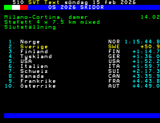 OS 2026 SKIDOR Milano-Cortina, damer 14.02 Stafett 4 x 7.5 km mixed Slutställning 1. Norge NOR 1:15:44.8 2. Sverige SWE +50.9 3. Finland FIN +1:14.7 4. Tyskland GER +1:36.0 5. USA USA +1:52.2 6. Italien ITA +1:59.7 7. Schweiz SUI +2:17.3 8. Kanada CAN +3:35.9 9. Frankrike FRA +4:43.8 10. Österrike AUT +4:49.0 +Dela 67 dagar