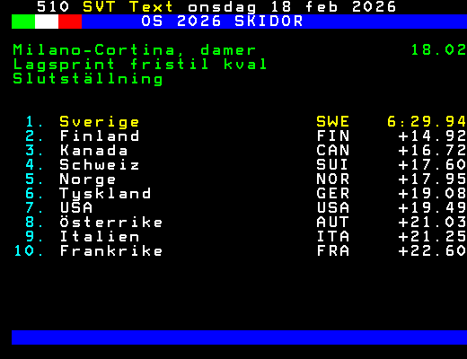 OS 2026 SKIDOR Milano-Cortina, damer 18.02 Lagsprint fristil kval Slutställning 1. Sverige SWE 6:29.94 2. Finland FIN +14.92 3. Kanada CAN +16.72 4. Schweiz SUI +17.60 5. Norge NOR +17.95 6. Tyskland GER +19.08 7. USA USA +19.49 8. Österrike AUT +21.03 9. Italien ITA +21.25 10. Frankrike FRA +22.60 +Dela 64 dagar
