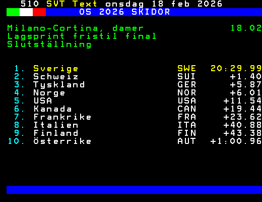 OS 2026 SKIDOR Milano-Cortina, damer 18.02 Lagsprint fristil final Slutställning 1. Sverige SWE 20:29.99 2. Schweiz SUI +1.40 3. Tyskland GER +5.87 4. Norge NOR +6.01 5. USA USA +11.54 6. Kanada CAN +19.44 7. Frankrike FRA +23.62 8. Italien ITA +40.88 9. Finland FIN +43.38 10. Österrike AUT +1:00.96 +Dela 63 dagar