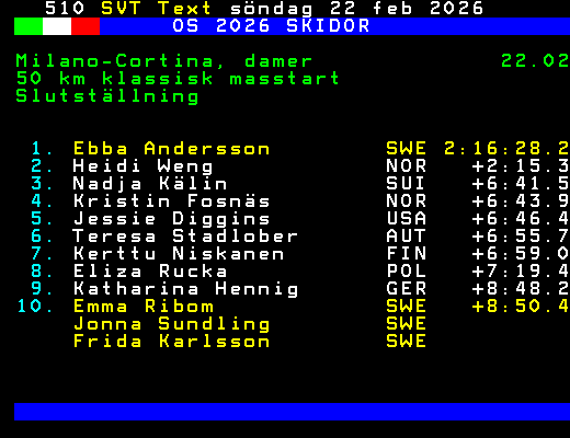 OS 2026 SKIDOR Milano-Cortina, damer 22.02 50 km klassisk masstart Slutställning 1. Ebba Andersson SWE 2:16:28.2 2. Heidi Weng NOR +2:15.3 3. Nadja Kälin SUI +6:41.5 4. Kristin Fosnäs NOR +6:43.9 5. Jessie Diggins USA +6:46.4 6. Teresa Stadlober AUT +6:55.7 7. Kerttu Niskanen FIN +6:59.0 8. Eliza Rucka POL +7:19.4 9. Katharina Hennig GER +8:48.2 10. Emma Ribom SWE +8:50.4 Jonna Sundling SWE Frida Karlsson SWE +Dela 59 dagar