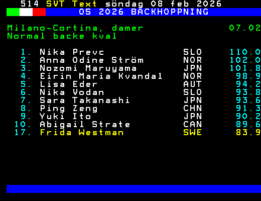 SVT Text Sön 08 Feb. 2026 OS 2026 BACKHOPPNING Milano-Cortina, damer 07.02 Normal backe kval 1. Nika Prevc SLO 110.0 2. Anna Odine Ström NOR 102.0 3. Nozomi Maruyama JPN 101.8 4. Eirin Maria Kvandal NOR 98.9 5. Lisa Eder AUT 94.2 6. Nika Vodan SLO 93.8 7. Sara Takanashi JPN 93.6 8. Ping Zeng CHN 91.3 9. Yuki Ito JPN 90.2 10. Abigail Strate CAN 89.6 17. Frida Westman SWE 83.9 +Dela 73 dagar