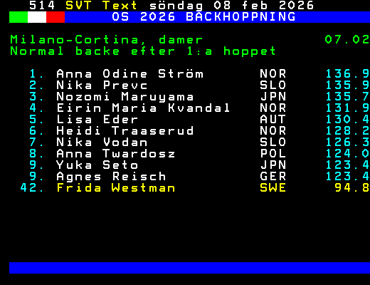 OS 2026 BACKHOPPNING Milano-Cortina, damer 07.02 Normal backe efter 1:a hoppet 1. Anna Odine Ström NOR 136.9 2. Nika Prevc SLO 135.9 3. Nozomi Maruyama JPN 135.7 4. Eirin Maria Kvandal NOR 131.9 5. Lisa Eder AUT 130.4 6. Heidi Traaserud NOR 128.2 7. Nika Vodan SLO 126.3 8. Anna Twardosz POL 124.0 9. Yuka Seto JPN 123.4 9. Agnes Reisch GER 123.4 42. Frida Westman SWE 94.8 +Dela 73 dagar