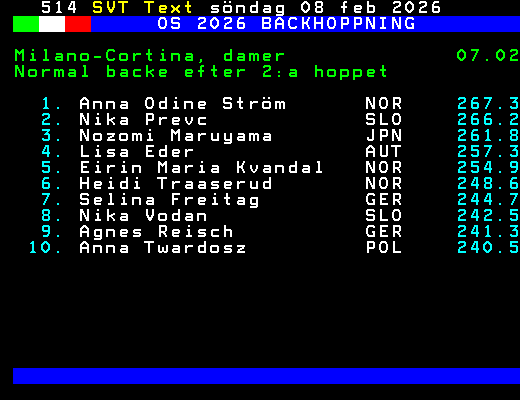 OS 2026 BACKHOPPNING Milano-Cortina, damer 07.02 Normal backe efter 2:a hoppet 1. Anna Odine Ström NOR 267.3 2. Nika Prevc SLO 266.2 3. Nozomi Maruyama JPN 261.8 4. Lisa Eder AUT 257.3 5. Eirin Maria Kvandal NOR 254.9 6. Heidi Traaserud NOR 248.6 7. Selina Freitag GER 244.7 8. Nika Vodan SLO 242.5 9. Agnes Reisch GER 241.3 10. Anna Twardosz POL 240.5 +Dela 73 dagar