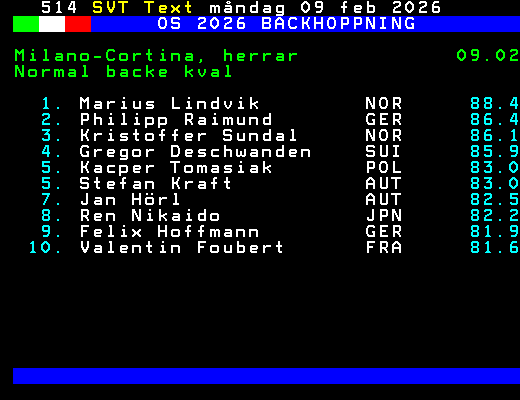 OS 2026 BACKHOPPNING Milano-Cortina, herrar 09.02 Normal backe kval 1. Marius Lindvik NOR 88.4 2. Philipp Raimund GER 86.4 3. Kristoffer Sundal NOR 86.1 4. Gregor Deschwanden SUI 85.9 5. Kacper Tomasiak POL 83.0 5. Stefan Kraft AUT 83.0 7. Jan Hörl AUT 82.5 8. Ren Nikaido JPN 82.2 9. Felix Hoffmann GER 81.9 10. Valentin Foubert FRA 81.6 +Dela 72 dagar