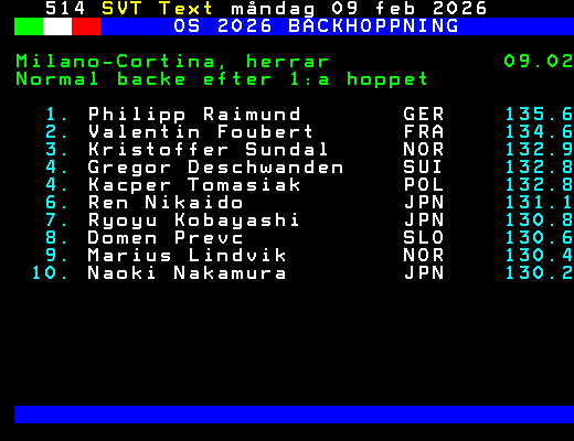 OS 2026 BACKHOPPNING Milano-Cortina, herrar 09.02 Normal backe efter 1:a hoppet 1. Philipp Raimund GER 135.6 2. Valentin Foubert FRA 134.6 3. Kristoffer Sundal NOR 132.9 4. Gregor Deschwanden SUI 132.8 4. Kacper Tomasiak POL 132.8 6. Ren Nikaido JPN 131.1 7. Ryoyu Kobayashi JPN 130.8 8. Domen Prevc SLO 130.6 9. Marius Lindvik NOR 130.4 10. Naoki Nakamura JPN 130.2 +Dela 72 dagar