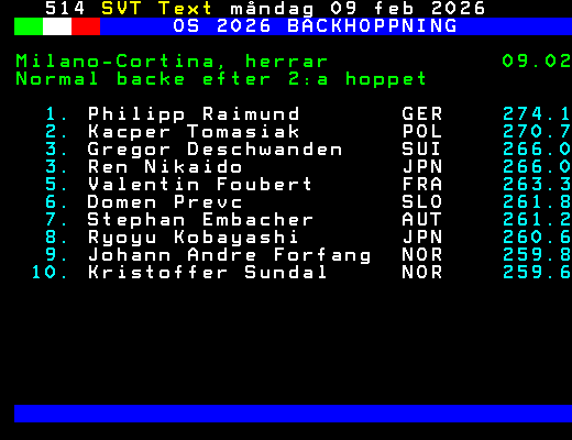 OS 2026 BACKHOPPNING Milano-Cortina, herrar 09.02 Normal backe efter 2:a hoppet 1. Philipp Raimund GER 274.1 2. Kacper Tomasiak POL 270.7 3. Gregor Deschwanden SUI 266.0 3. Ren Nikaido JPN 266.0 5. Valentin Foubert FRA 263.3 6. Domen Prevc SLO 261.8 7. Stephan Embacher AUT 261.2 8. Ryoyu Kobayashi JPN 260.6 9. Johann Andre Forfang NOR 259.8 10. Kristoffer Sundal NOR 259.6 +Dela 72 dagar