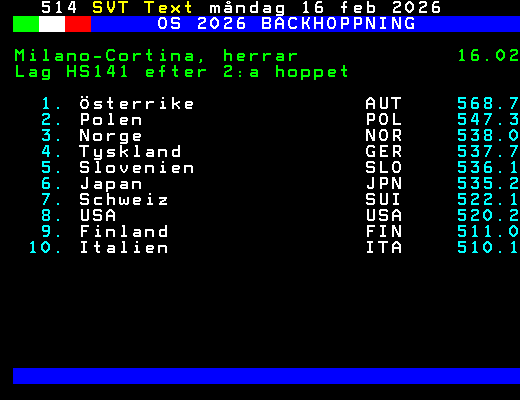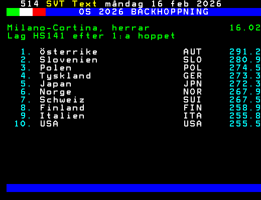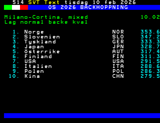 OS 2026 BACKHOPPNING Milano-Cortina, mixed 10.02 Lag normal backe kval 1. Norge NOR 353.6 2. Slovenien SLO 347.2 3. Tyskland GER 333.3 4. Japan JPN 328.7 5. Österrike AUT 317.4 6. Finland FIN 311.3 7. USA USA 291.5 8. Italien ITA 288.6 9. Polen POL 286.3 10. Kina CHN 279.5 +Dela 71 dagar
