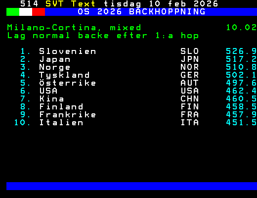 OS 2026 BACKHOPPNING Milano-Cortina, mixed 10.02 Lag normal backe efter 1:a hop 1. Slovenien SLO 526.9 2. Japan JPN 517.2 3. Norge NOR 510.8 4. Tyskland GER 502.1 5. Österrike AUT 497.6 6. USA USA 462.4 7. Kina CHN 460.5 8. Finland FIN 458.5 9. Frankrike FRA 457.9 10. Italien ITA 451.5 +Dela 71 dagar
