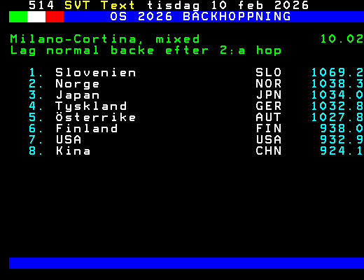 OS 2026 BACKHOPPNING Milano-Cortina, mixed 10.02 Lag normal backe efter 2:a hop 1. Slovenien SLO 1069.2 2. Norge NOR 1038.3 3. Japan JPN 1034.0 4. Tyskland GER 1032.8 5. Österrike AUT 1027.8 6. Finland FIN 938.0 7. USA USA 932.9 8. Kina CHN 924.1 +Dela 71 dagar