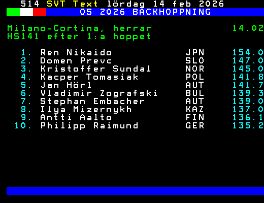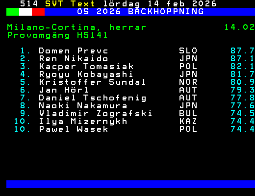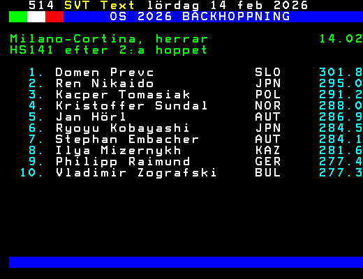 OS 2026 BACKHOPPNING Milano-Cortina, herrar 14.02 HS141 efter 2:a hoppet 1. Domen Prevc SLO 301.8 2. Ren Nikaido JPN 295.0 3. Kacper Tomasiak POL 291.2 4. Kristoffer Sundal NOR 288.0 5. Jan Hörl AUT 286.9 6. Ryoyu Kobayashi JPN 284.5 7. Stephan Embacher AUT 284.1 8. Ilya Mizernykh KAZ 281.6 9. Philipp Raimund GER 277.4 10. Vladimir Zografski BUL 277.3 +Dela 67 dagar