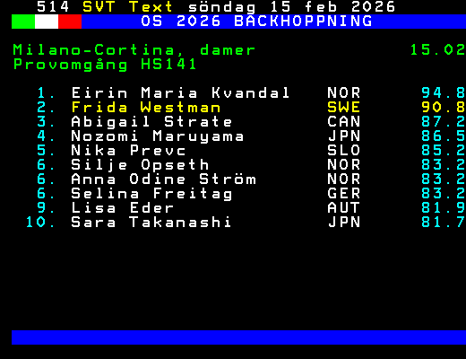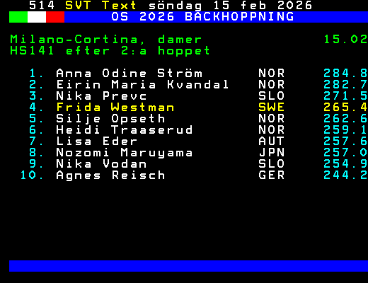 OS 2026 BACKHOPPNING Milano-Cortina, damer 15.02 HS141 efter 2:a hoppet 1. Anna Odine Ström NOR 284.8 2. Eirin Maria Kvandal NOR 282.7 3. Nika Prevc SLO 271.5 4. Frida Westman SWE 265.4 5. Silje Opseth NOR 262.6 6. Heidi Traaserud NOR 259.1 7. Lisa Eder AUT 257.6 8. Nozomi Maruyama JPN 257.0 9. Nika Vodan SLO 254.9 10. Agnes Reisch GER 244.2 +Dela 66 dagar