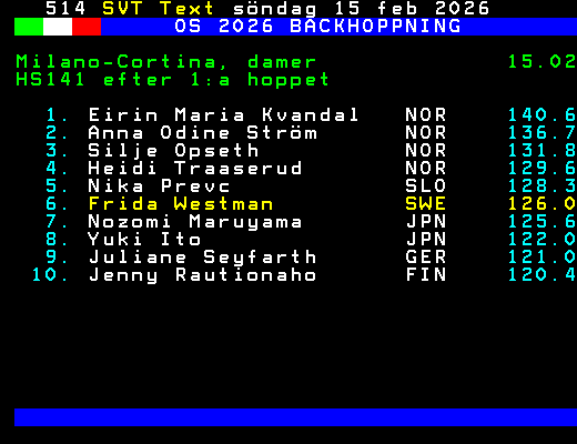 OS 2026 BACKHOPPNING Milano-Cortina, damer 15.02 HS141 efter 1:a hoppet 1. Eirin Maria Kvandal NOR 140.6 2. Anna Odine Ström NOR 136.7 3. Silje Opseth NOR 131.8 4. Heidi Traaserud NOR 129.6 5. Nika Prevc SLO 128.3 6. Frida Westman SWE 126.0 7. Nozomi Maruyama JPN 125.6 8. Yuki Ito JPN 122.0 9. Juliane Seyfarth GER 121.0 10. Jenny Rautionaho FIN 120.4 +Dela 66 dagar