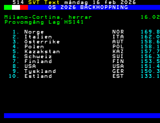 OS 2026 BACKHOPPNING Milano-Cortina, herrar 16.02 Provomgång Lag HS141 1. Norge NOR 169.8 2. Italien ITA 162.0 3. Österrike AUT 158.6 4. Polen POL 158.1 5. Kazakstan KAZ 157.7 6. Schweiz SUI 156.3 7. Finland FIN 153.5 8. USA USA 151.4 9. Tyskland GER 150.3 10. Estland EST 133.1 +Dela 65 dagar
