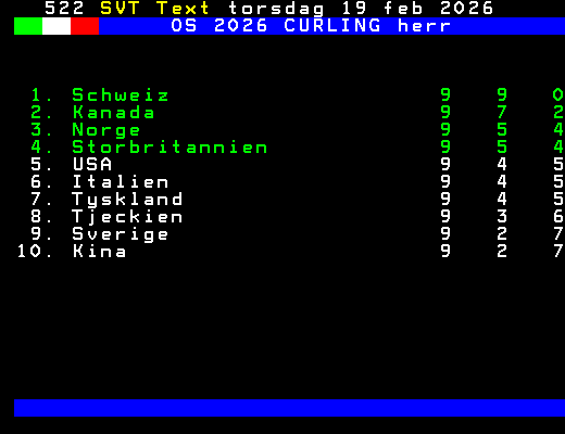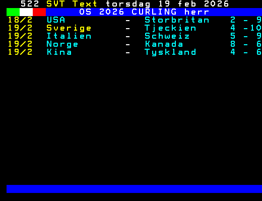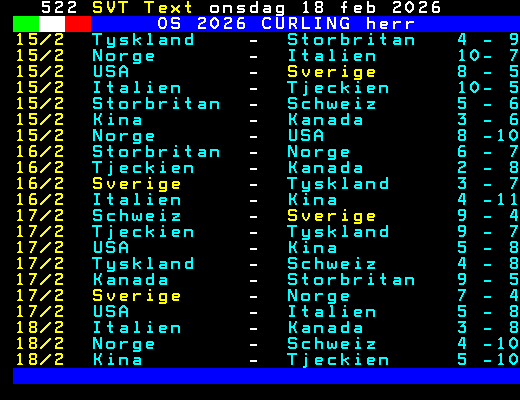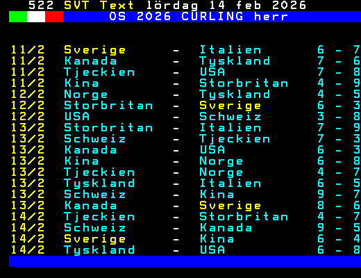 SVT Text Lör 14 Feb. 2026 OS 2026 CURLING herr 11/2 Sverige - Italien 6 - 7 11/2 Kanada - Tyskland 7 - 6 11/2 Tjeckien - USA 7 - 8 11/2 Kina - Storbritan 4 - 9 12/2 Norge - Tyskland 4 - 5 12/2 Storbritan - Sverige 6 - 3 12/2 USA - Schweiz 3 - 8 13/2 Storbritan - Italien 7 - 9 13/2 Schweiz - Tjeckien 7 - 3 13/2 Kanada - USA 6 - 3 13/2 Kina - Norge 6 - 8 13/2 Tjeckien - Norge 4 - 7 13/2 Tyskland - Italien 6 - 5 13/2 Schweiz - Kina 9 - 7 13/2 Kanada - Sverige 8 - 6 14/2 Tjeckien - Storbritan 4 - 7 14/2 Schweiz - Kanada 9 - 5 14/2 Sverige - Kina 6 - 4 14/2 Tyskland - USA 6 - 8 +Dela 67 dagar
