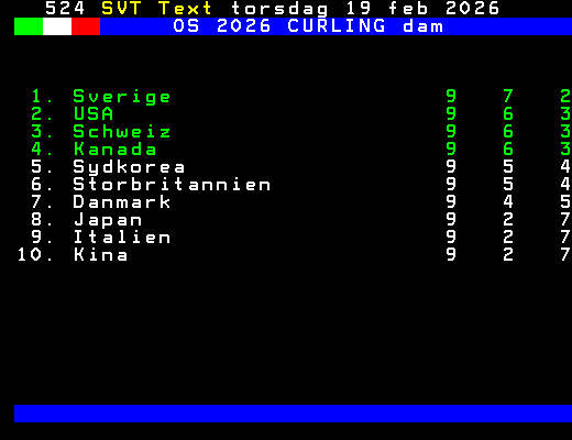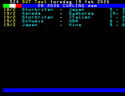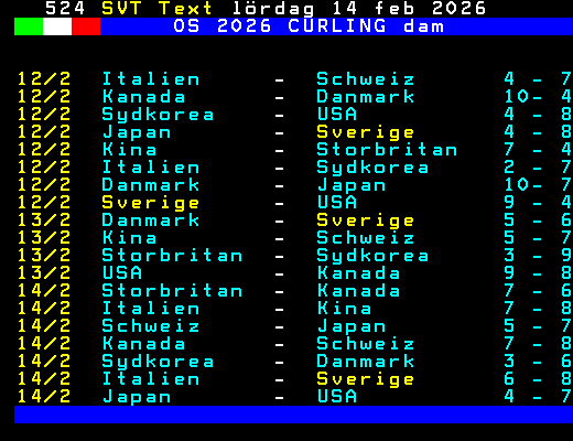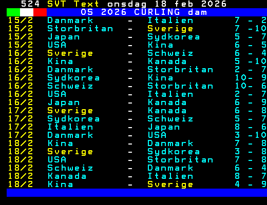 SVT Text Lör 14 Feb. 2026 OS 2026 CURLING dam 12/2 Italien - Schweiz 4 - 7 12/2 Kanada - Danmark 10- 4 12/2 Sydkorea - USA 4 - 8 12/2 Japan - Sverige 4 - 8 12/2 Kina - Storbritan 7 - 4 12/2 Italien - Sydkorea 2 - 7 12/2 Danmark - Japan 10- 7 12/2 Sverige - USA 9 - 4 13/2 Danmark - Sverige 5 - 6 13/2 Kina - Schweiz 5 - 7 13/2 Storbritan - Sydkorea 3 - 9 13/2 USA - Kanada 9 - 8 14/2 Storbritan - Kanada 7 - 6 14/2 Italien - Kina 7 - 8 14/2 Schweiz - Japan 5 - 7 14/2 Kanada - Schweiz 7 - 8 14/2 Sydkorea - Danmark 3 - 6 14/2 Italien - Sverige 6 - 8 14/2 Japan - USA 4 - 7 +Dela 67 dagar