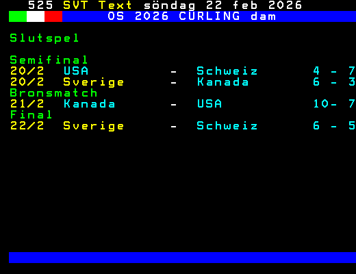 SVT Text Sön 22 Feb. 2026 OS 2026 CURLING dam Slutspel Semifinal 20/2 USA - Schweiz 4 - 7 20/2 Sverige - Kanada 6 - 3 Bronsmatch 21/2 Kanada - USA 10- 7 Final 22/2 Sverige - Schweiz 6 - 5 +Dela 59 dagar