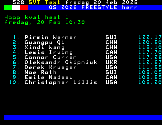 SVT Text Lör 21 Feb. 2026 OS 2026 FREESTYLE herr Hopp kval heat 1 fredag, 20 Feb 10:30 1. Pirmin Werner SUI 122.17 2. Guangpu Qi CHN 120.80 3. Xindi Wang CHN 118.10 4. Lewis Irving CAN 117.70 5. Connor Curran USA 117.26 6. Oleksandr Okipniuk UKR 112.67 7. Derek Krueger USA 111.95 8. Noe Roth SUI 109.05 9. Emile Nadeau CAN 108.85 10. Christopher Lillis USA 106.20 +Dela 62 dagar