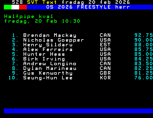 OS 2026 FREESTYLE herr Halfpipe kval fredag, 20 Feb 10:30 1. Brendan Mackay CAN 92.75 2. Nicholas Goepper USA 90.00 3. Henry Sildaru EST 88.00 4. Alex Ferreira USA 85.75 5. Hunter Hess USA 85.00 6. Birk Irving USA 84.25 7. Andrew Longino CAN 83.50 8. Dylan Marineau CAN 82.25 9. Gus Kenworthy GBR 81.25 10. Seung-Hun Lee KOR 76.00 +Dela 61 dagar