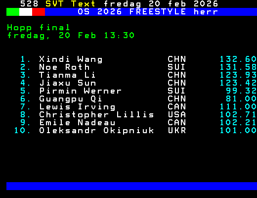 OS 2026 FREESTYLE herr Hopp final fredag, 20 Feb 13:30 1. Xindi Wang CHN 132.60 2. Noe Roth SUI 131.58 3. Tianma Li CHN 123.93 4. Jiaxu Sun CHN 123.42 5. Pirmin Werner SUI 99.32 6. Guangpu Qi CHN 81.00 7. Lewis Irving CAN 111.00 8. Christopher Lillis USA 102.71 9. Emile Nadeau CAN 102.21 10. Oleksandr Okipniuk UKR 101.00 +Dela 61 dagar