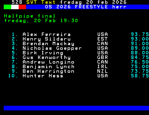 OS 2026 FREESTYLE herr Halfpipe final fredag, 20 Feb 19:30 1. Alex Ferreira USA 93.75 2. Henry Sildaru EST 93.00 3. Brendan Mackay CAN 91.00 4. Nicholas Goepper USA 89.00 5. Birk Irving USA 88.00 6. Gus Kenworthy GBR 84.75 7. Andrew Longino CAN 76.50 8. Benjamin Lynch IRL 75.00 9. Ben Harrington NZL 73.75 10. Hunter Hess USA 58.75 +Dela 61 dagar